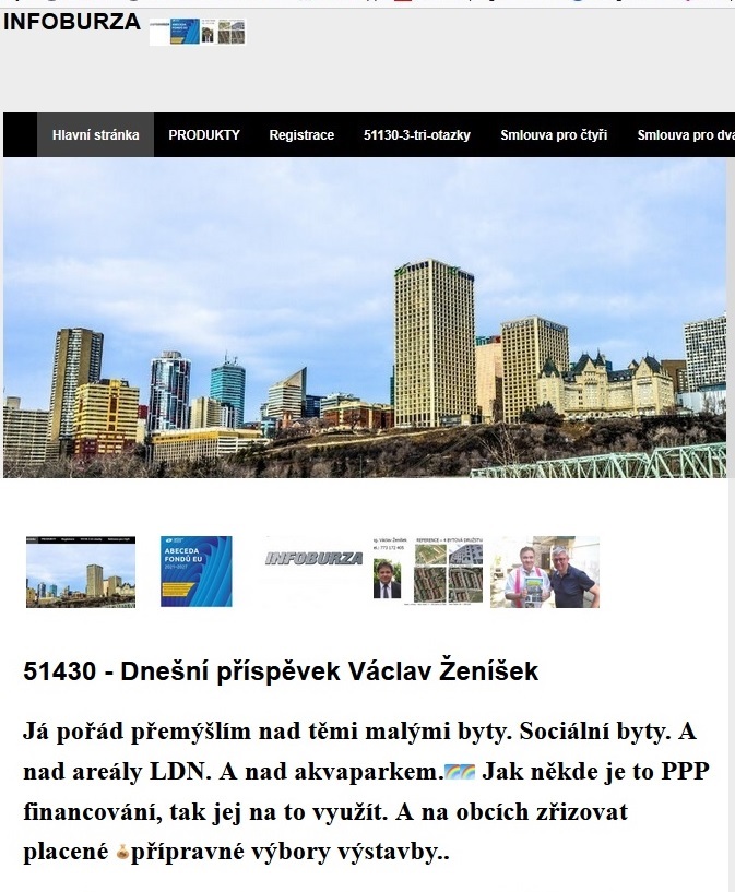 Je 22 obecních úřadů v Praze a na všech by se daly dělat vystoupení pana Miloše Hory s mými povídkami a s panem Ing. architektem Milanem Urbanem. Taková zajímavá trojice bychom byli. Pan Ing. architekt Milan Urban studoval vysokou školu v Německu a pak má 40 let zahraničních zkušeností, třeba ze Saudské Arábie. A pan Miloš Hora je bývalý developer, který postavil se svojí firmou Bussmark 2.500 bytů a kupoval tenkrát pozemky od H-Systému od pana Smetky. A privatizoval dům Arnika v Praze 10 na Zahradním Městě.