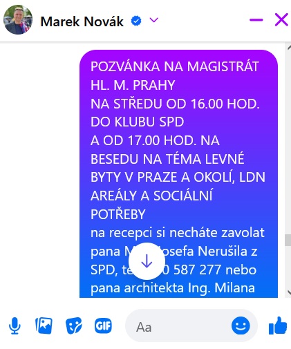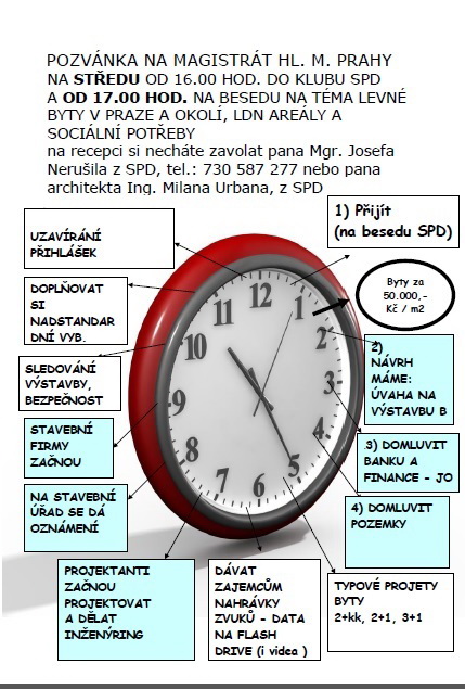 pan Milan Urban píše: to by možná pro Vás bylo lepší se setkat příští týden ve středu v 16.00 hod na Klubu SPD na magistrátě. Adresa: MHMP, Mariánské náměstí, Praha 1. Můžeme se tam v klidu posadit ke kávě. Od 17:00 pak máme schůzku tamtéž pro seniory. Kde chceme diskutovat témata důchody, lékařská péče, LDN, domovy pro seniory. dostupné bydlení.