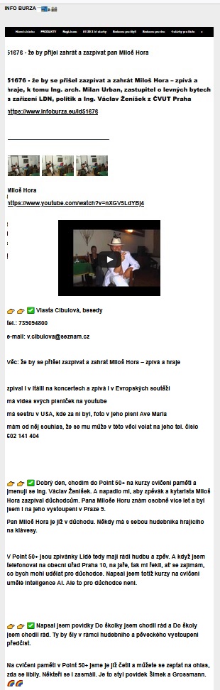 Můžete si jej všichni najít a na Magistrátu Hl. m. Prahy ve středu od 16.00 hod. a pak od 17.00 hod, jsou jednání a besedy pro diskuse. Na které by mohl chodit také Miloš Hora, bývalý developer, který nyní hraje a zpívá na svatbách, hraje běžně důchodcům a má videa svých písniček na YouTube.